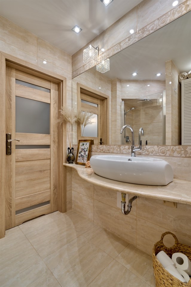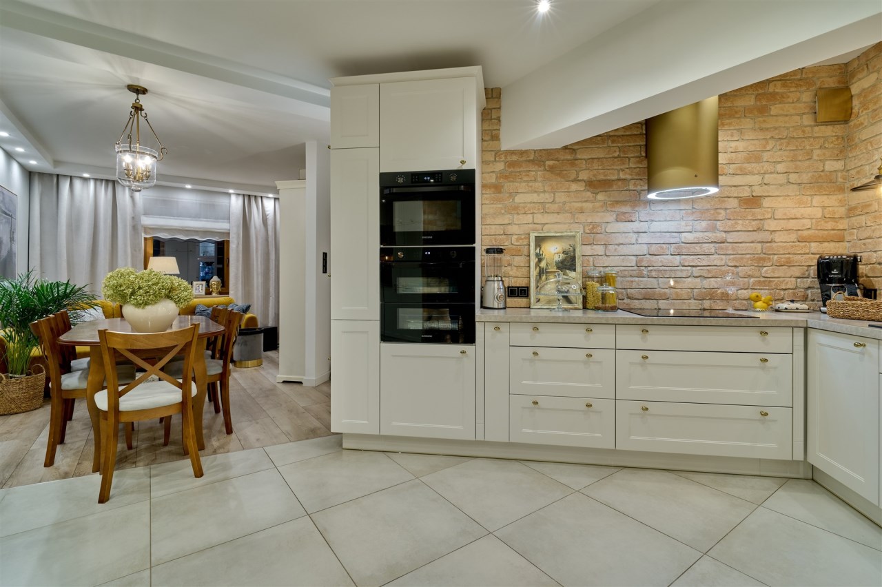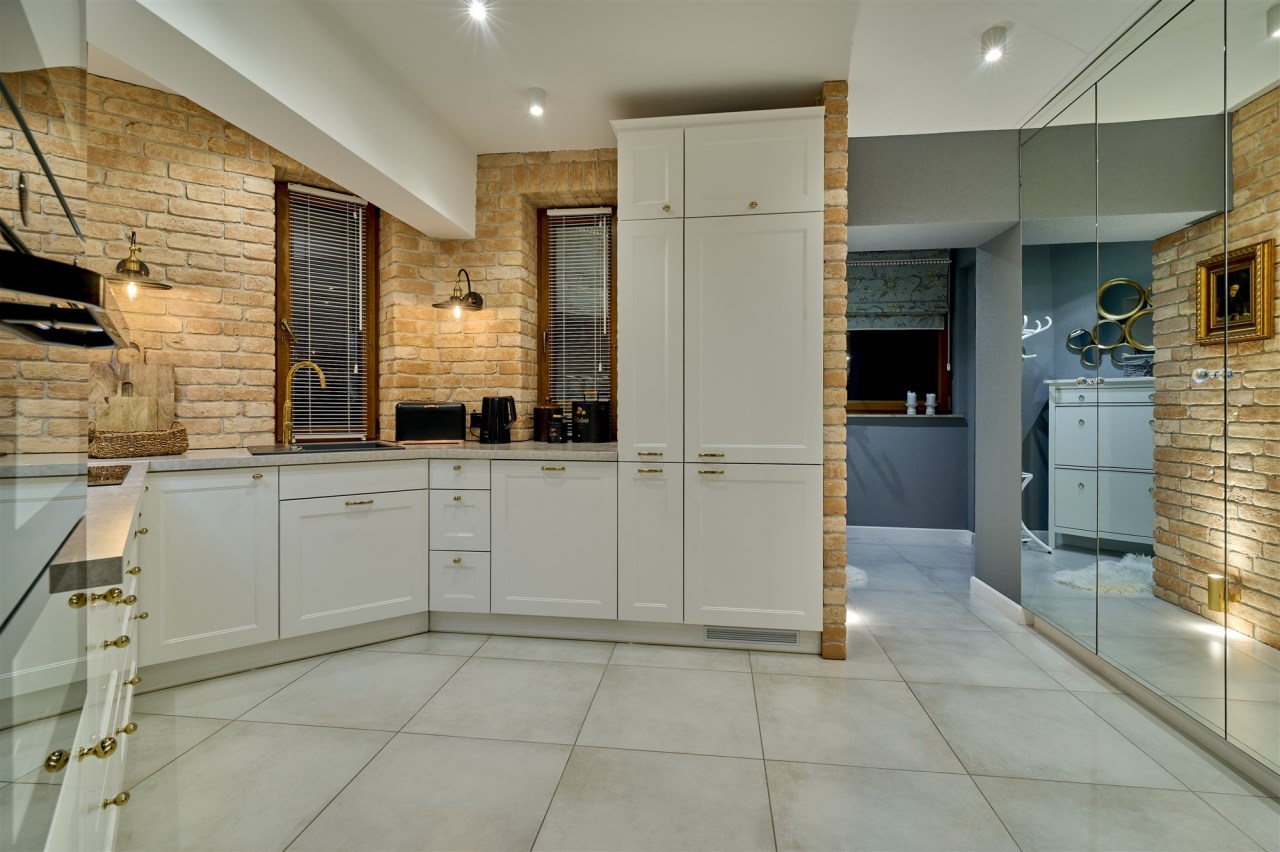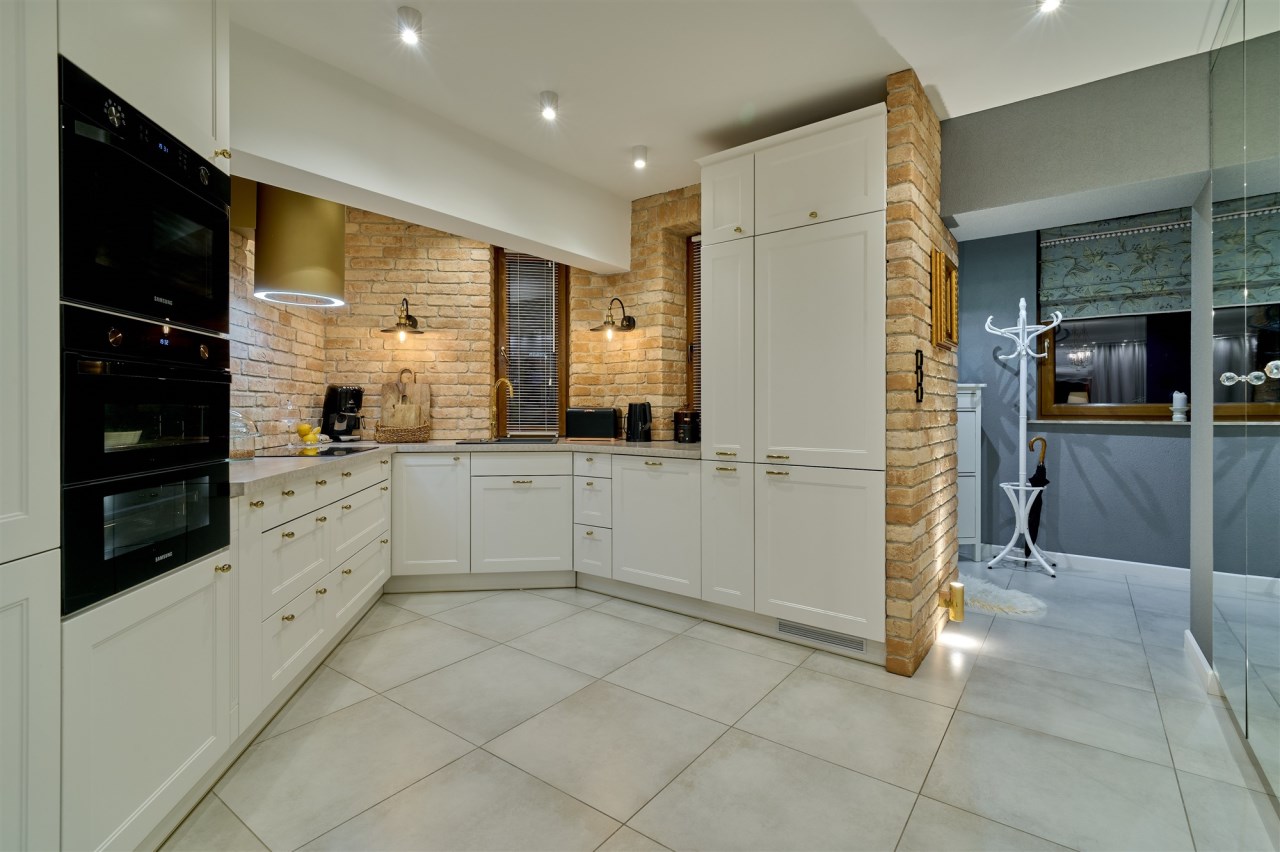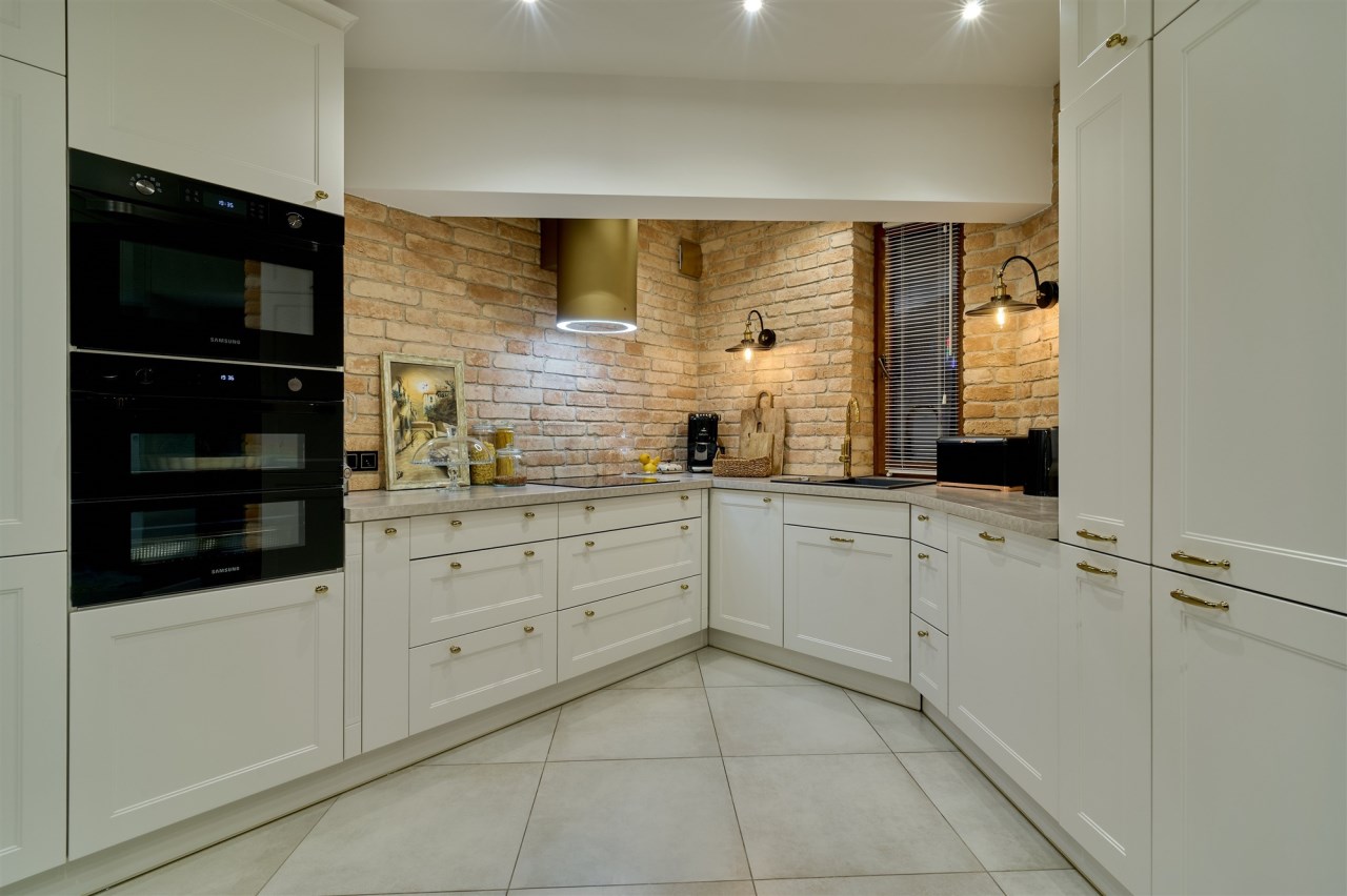 w kuchni dokładnie zaprojektowane meble z dbałością o każdy detal oraz kamienny blat,